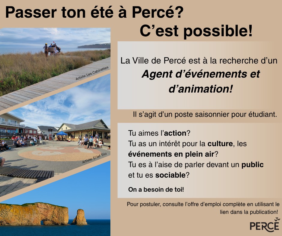 Lieu de travail : Espace Suzanne-Guité, autres lieux sur le territoire de Percé selon