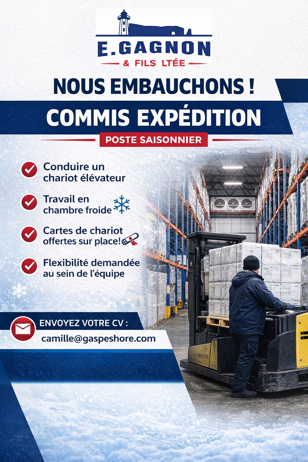 - Être un opérateur de chariot élévateur aguerri, possibilité de renouveler votre carte sur place;