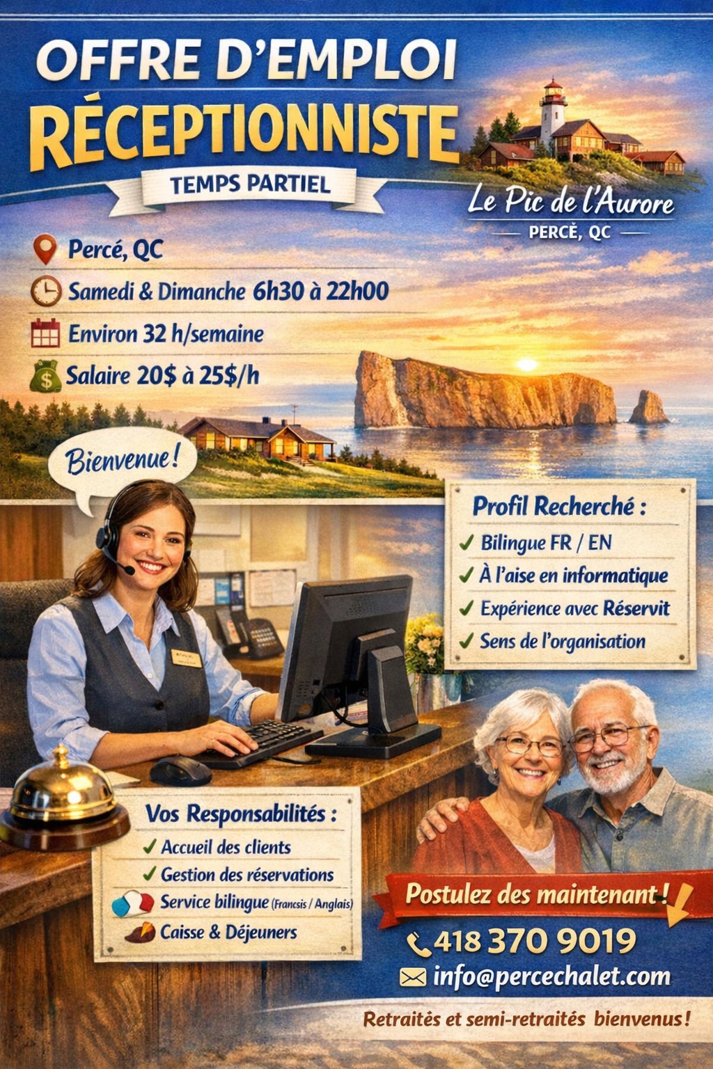 Le Pic de l’Aurore, lieu emblématique de Percé, recherche une personne fiable et dynamique pour accueillir notre clientèle et assurer la bonne gestion des arrivées.
